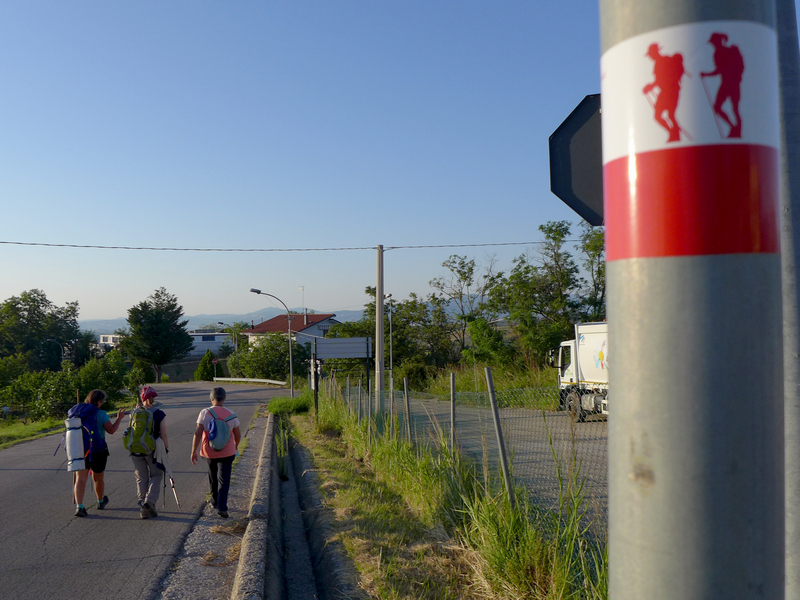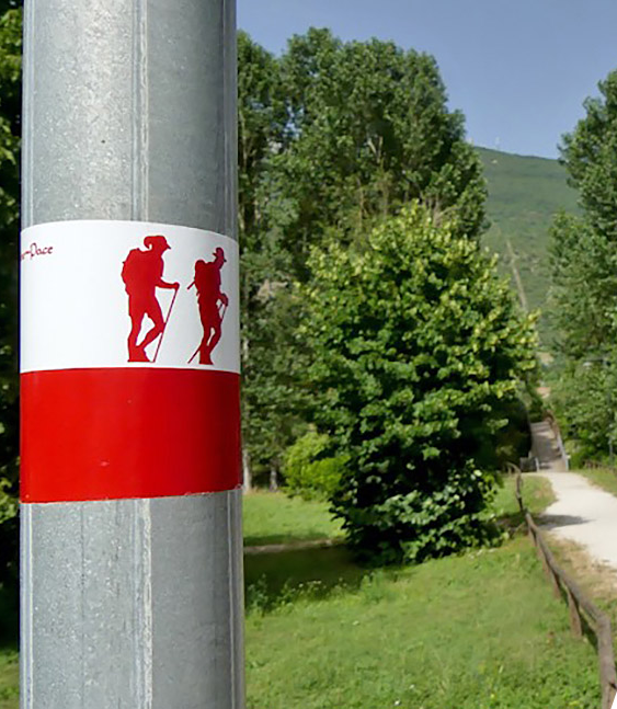 All’interno di altre aree protette si troveranno tabelle di piccolo formato, applicate sulla segnaletica in legno esistente, con il logo del Cammino e una freccia rossa che indica la direzione.