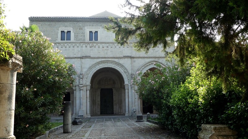 Secondo quanto riportato nel celebre Chronicon Casauriense, l’abbazia sarebbe sorta su un’insula Piscariae negli anni intorno all’870, a seguito di un voto fatto dall’imperatore Ludovico II durante la sua prigionia presso il Ducato longobardo di Benevento. Lo stesso Ludovico, in seguito, avrebbe donato al monastero una reliquia di san Clemente, ricevuta direttamente dalle mani di papa Adriano II, da cui il complesso trasse l’intitolazione. Distrutta dai Saraceni intorno al 911 e ricostruita nell’XI secolo, San Clemente dovette ben presto subito le ingerenze dei Normanni, che la saccheggiarono e devastarono; si deve all’autorevole abate Leonate la riaffermazione del potere politico e religioso dell’abbazia, anche mediante la ricostruzione del complesso, avviata nel 1176. Leonate, però, non riuscì a vedere la conclusione dei lavori da lui intrapresi, a causa della morte sopraggiunta nel 1182. Il monumento è uno dei più noti e significativi dell’arte romanica abruzzese ed è giunto fino ad oggi, nelle forme conferite da Leonate, grazie ad una lunga serie di restauri. La chiesa è caratterizzata da un grande portico a tre archi antistante la facciata, con capitelli e archivolti finemente intagliati. Vero capolavoro è il portale principale (fig. p. preced.), che reca sugli stipiti quattro sovrani con in mano i privilegi concessi all’abbazia e mostra scolpita nell’architrave la vicenda dell’acquisizione dei diritti sull’Insula Piscariae da parte dell’imperatore Ludovico e la fondazione della primitiva abbazia della SS. Trinità (sul lato destro dell’architrave), e il trasporto delle reliquie di san Clemente papa a dorso di asino da Roma (sul lato sinistro); nella lunetta, invece, si vede Leonate colto nell’atto di donare la chiesa al Santo. Le grandi ante di bronzo del portone centrale, volute dall’abate Gioele e composte da 70 formelle (purtroppo molte sono mancanti), ricordavano tutti i castelli posseduti dall’abbazia. Al di sopra del portico si trova un oratorio che l’abate Leonate volle intitolare alla Santa Croce, a San Michele Arcangelo ea San Tommaso Becket. L’interno, scandito in tre navate con unica abside a chiudere quella centrale, è strutturato su due diversi livelli di quota tra aula e presbiterio a causa della presenza della cripta, che secondo alcuni sarebbe la sola parte superstite della costruzione originaria. Colpisce la straordinaria lavorazione dell’ambone in pietra a cassa quadrangolare, della fine del XII secolo, con grandi fiori a rilievo traforati di finissima fattura, capolavoro assoluto della scultura medievale abruzzese (fig. a dx); di fronte, un elegante candelabro per il cero pasquale, le cui preziose decorazioni a mosaico di tipo cosmatesco della lanterna lo fanno datare al ‘200. L’altare è un sarcofago paleocristiano del IV secolo, sormontato da un pregevole ciborio del ‘400 lavorato su tutte le facce, che ripropone anche la vicenda della fondazione dell’abbazia già vista nel portale.All’interno dell’altare venne trovata un’urna cineraria di marmo di età romana, oggi esposta nell’ala destra del transetto, che secondo alcuni sarebbe quella utilizzata per il trasporto delle reliquie di san Clemente.